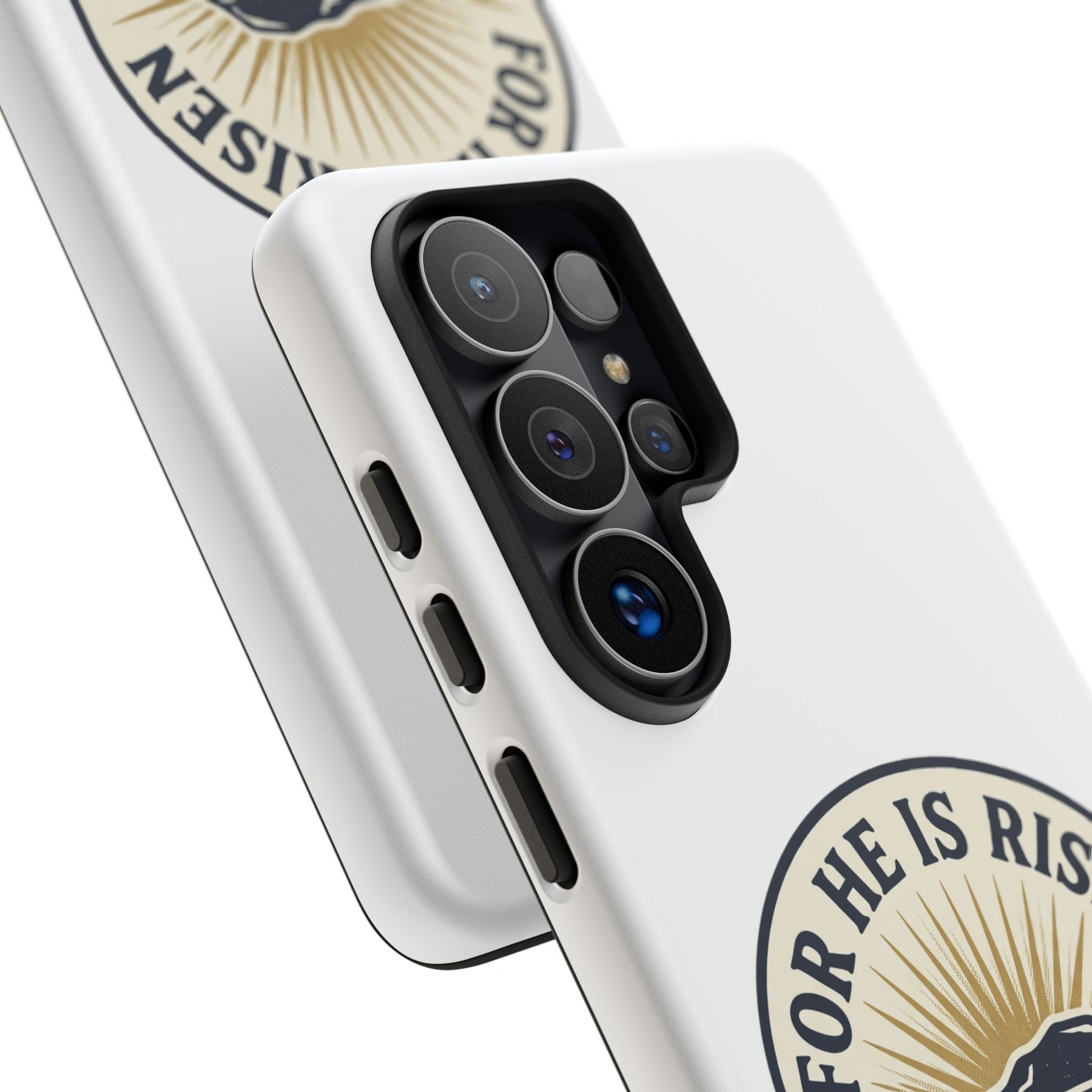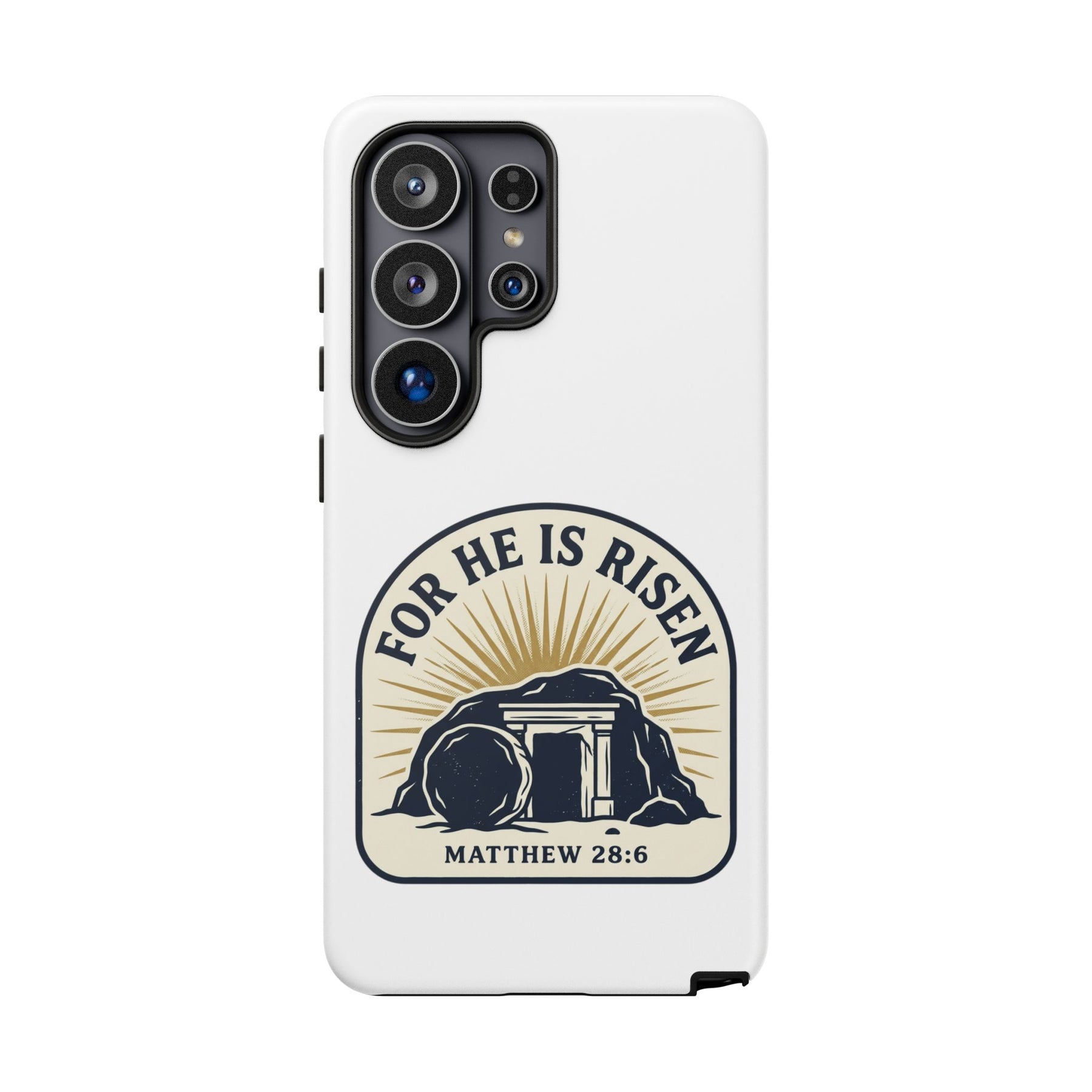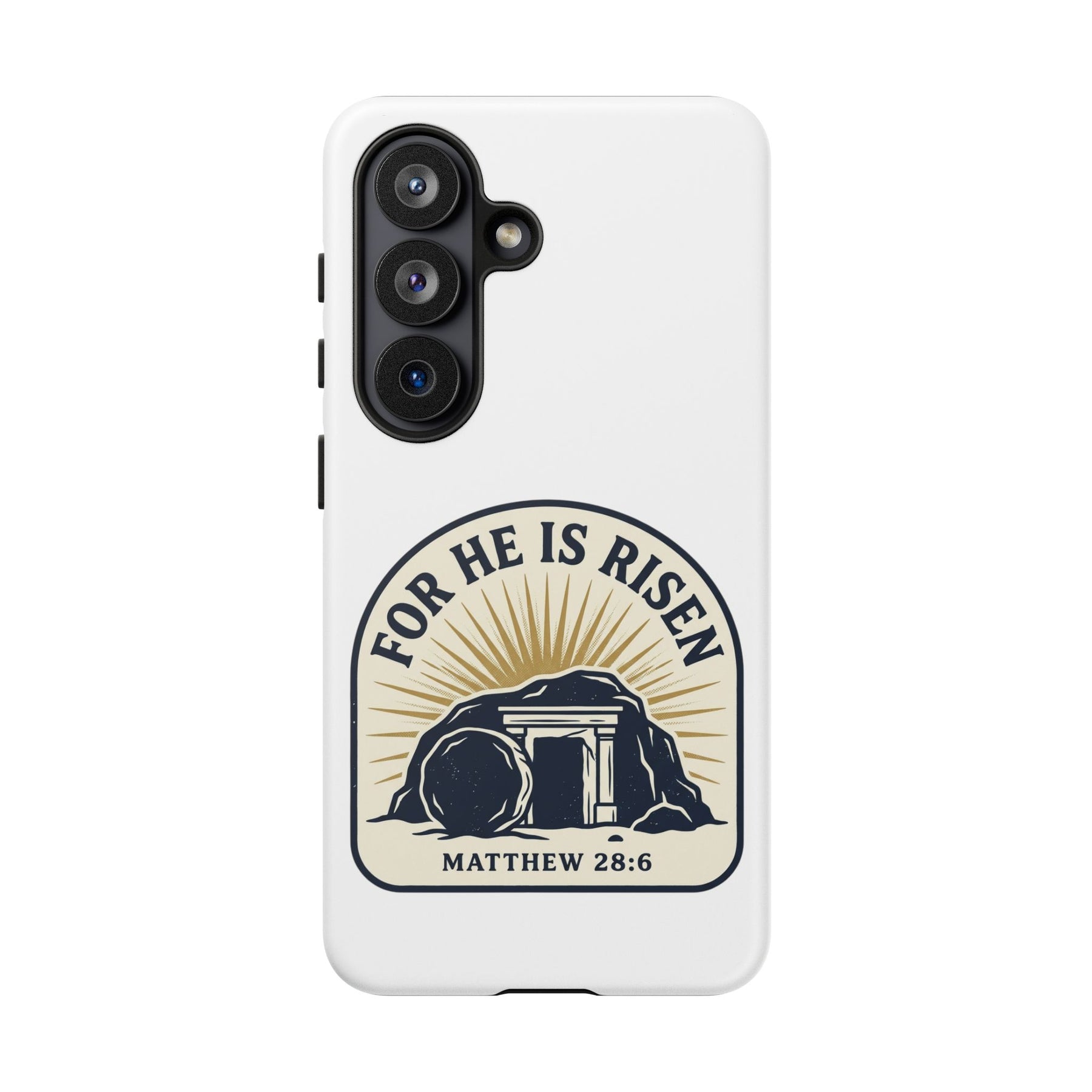 Carry a quiet, confident reminder of faith with a tough, everyday phone case that looks as composed as your convictions. The graphic — an opened tomb with a radiant sunrise and the words "For He Is Risen" with Matthew 28:6 — sits cleanly on a glossy or matte white background. The dual-layer shell shields your device from drops while the soft TPU liner cushions impacts. Lightweight and low-profile, it slips into pockets and bags without fuss. Whether you're headed to Sunday service, a community outreach, or simply living out your beliefs day by day, this case keeps the message visible and the phone protected. Designed to withstand outdoor wear and support wireless charging, it’s built for people who want faith-forward design and real protection in one simple accessory.